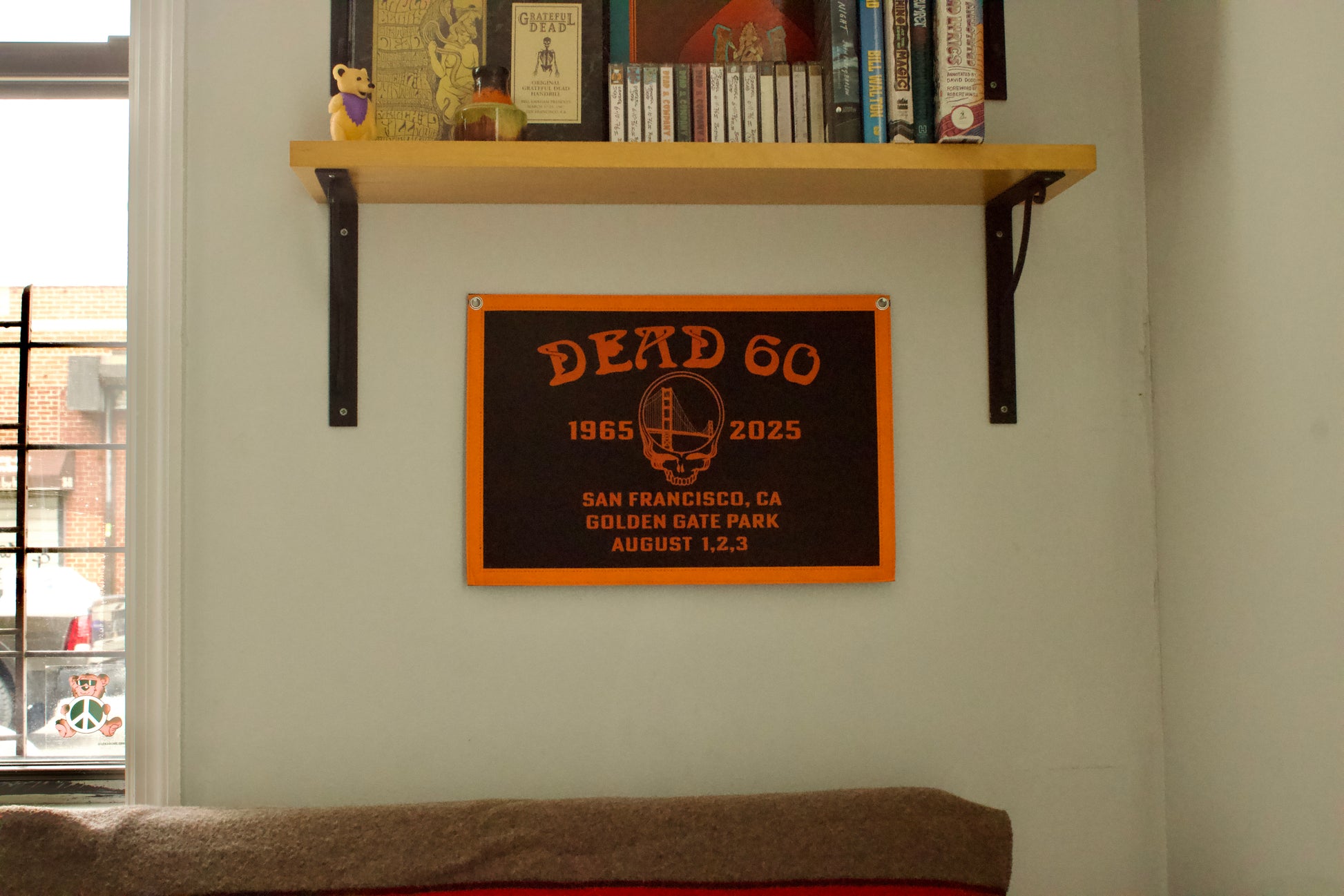 I wanted to design something to commemorate sixty years of the Grateful Dead that would hopefully last another 60 years. I have never designed a piece of memorabilia that would warrant being displayed on a wall and that there's where the idea for this pennant came from. I wanted to make something that would be "built to last".